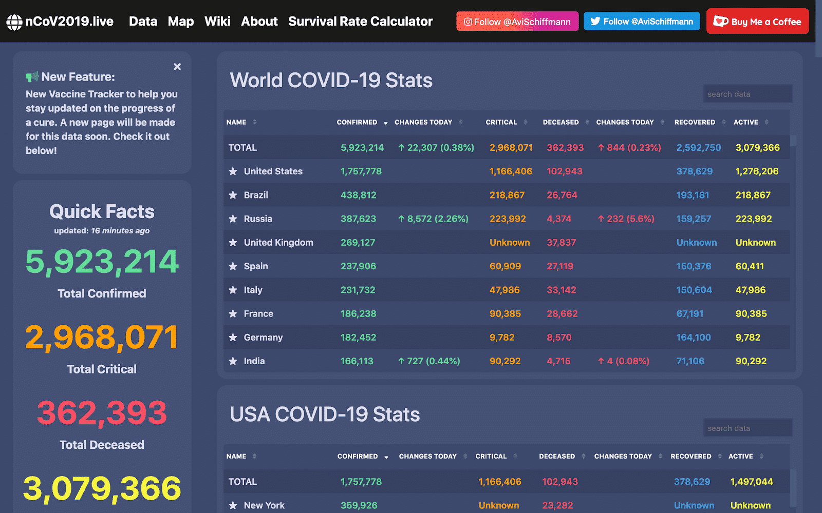 Stats on COVID-19 are also being monitored online. Avi Schiffman, a 17-year-old from Washington State, developed the site ncov2019.live and turned down an $8 million (USD) offer to keep the site ad-free. This website monitors stats on confirmed and critical cases, deaths, and recoveries from all over the world. It also has a Survival Rate Calculator to check your chances of contracting the virus.